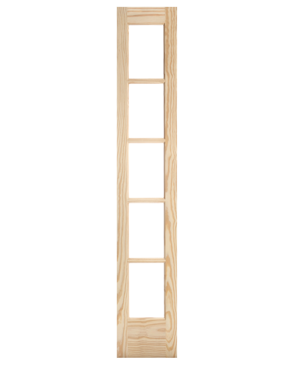 This French door features a 5-lite design on 1 3/8" thick pine. The 5-lite door works perfectly for a small single or double door opening. Smaller widths can even be used as a sidelight for larger door openings. The clear pine material can be finished using a rich stain or a clear top coat for a natural look.
